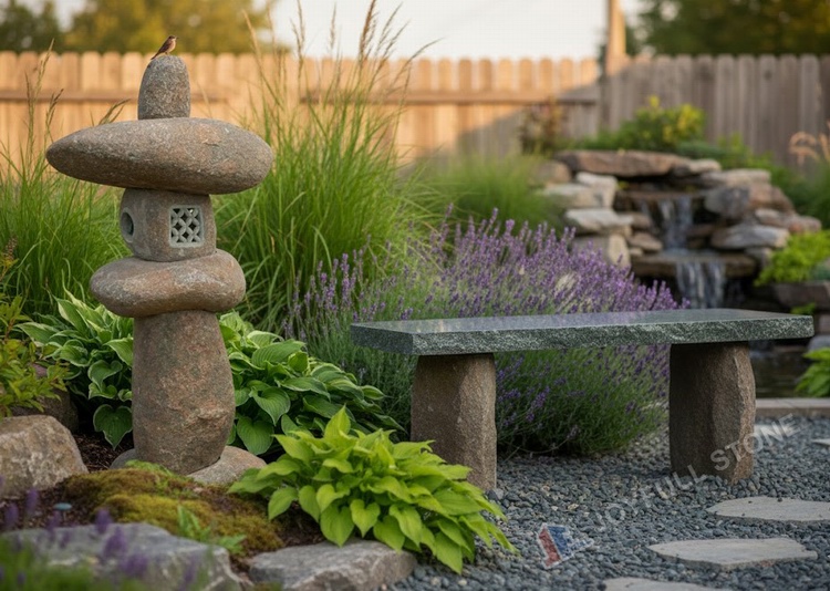 Water elements made from granite or marble introduce movement and sound, enhancing the sensory experience of the garden without overwhelming the design.